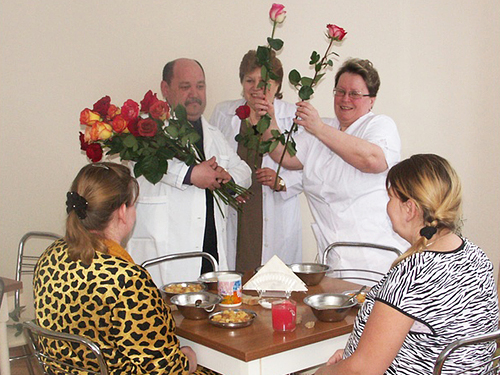 Глава Уржумского района В.В.Силин, главный врач Уржумской ЦРБ И.Н.Кощеева и заведующая акушерско-гинекологической службой района Т.А.Никулина поздравляют первых пациенток обновленного отделения с Международным женским днем. Фото с сайта urzhum.er.ru.