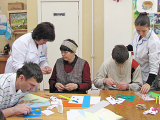 Пациенты под чутким руководством медицинского персонала изготавливали аппликации из скрученных в спиральки длинных и узких полосок бумаги.