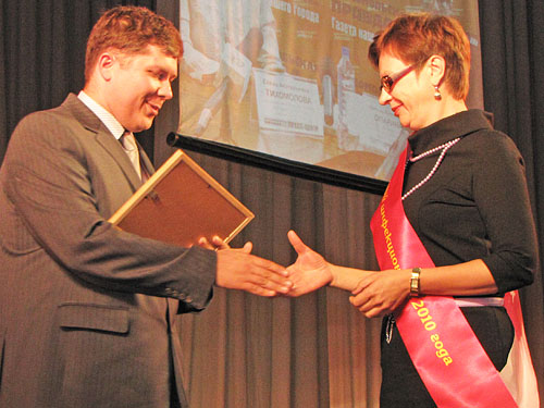 Д.А.Матвеев поздравляет с заслуженной наградой лучшего врача-инфекциониста по итогам 2010 года Е.Г.Тихомолову.