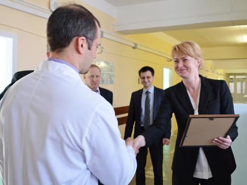 Глава департамента здравоохранения Е.Д.Утемова вручает главному врачу Оричевской ЦРБ А.В.Семенченко сертификат на новый наркозно-дыхательный аппарат.