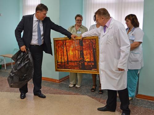 Первый заместитель Председателя Правительства Кировской области Д.А.Матвеев вручает подарок главному врачу Кировской областной детской клинической больницы А.В.Андронову.