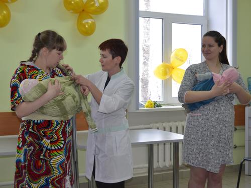 Представитель общественной организации "Белая река" Виолетта Кожева помогает участнице конкурса положить ребенка в слинг.