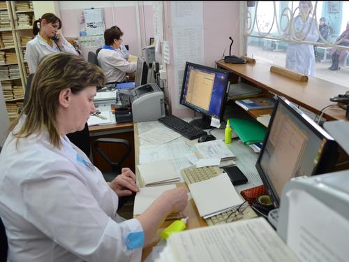 В регистратуре поликлиники Омутнинской ЦРБ.