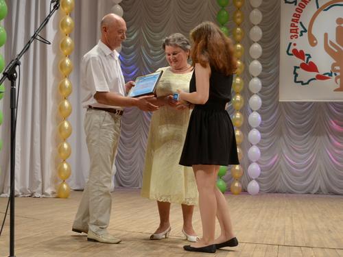 Заведующий хирургическим отделением Кировской городской клинической больницы №6 "Лепсе" В.Г.Андреев и заведующая отделением гинекологии Кировской областной клинической больницы Е.В.Закалата награждают победителей конкурса "Хочу стать доктором!"