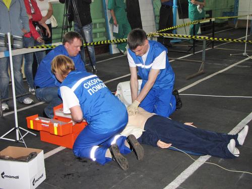 Проведение сердечно-легочной реанимации на учебном тренажере.