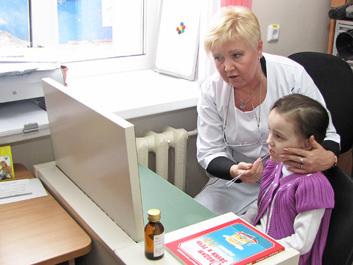 Сурдодефектолог Кировской областной детской клинической больницы Тамара Кислицына проводит занятие по развитию речи.